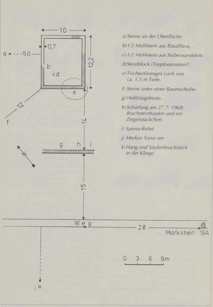 - Durch einen Sturm vom 22./23. November 1930 wurden zahlreiche Tannen gefällt, wobei unter einer Baumscheibe Mauersteine und etwa 50 m weiter gegen Nordwesten weitere Mauersteine, aber keine Ziegel entdeckt wurden.
