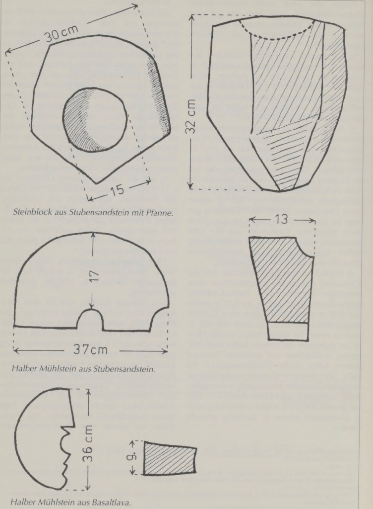 - Ein halber Mühlstein aus Basaltlava wurde ebenfalls bei derselben Grabung entdeckt.