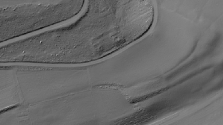 Die LIDAR-Karte offenbart zwischen den zwei eingezeichneten Fundstellen eine bemerkenswert rechteckige Struktur. Sie liegt verborgen im Wald, abseits der landwirtschaftlich genutzten Flächen, und grenzt unmittelbar an einen steil abfallenden Hang. Mit einer Ausdehnung von etwa 30 Metern Länge und 16 Metern Breite wirkt die Form ungewöhnlich regelmäßig. Auffällig sind zwei Vertiefungen im Boden, die sich jeweils westlich und östlich innerhalb dieser Fläche befinden.
