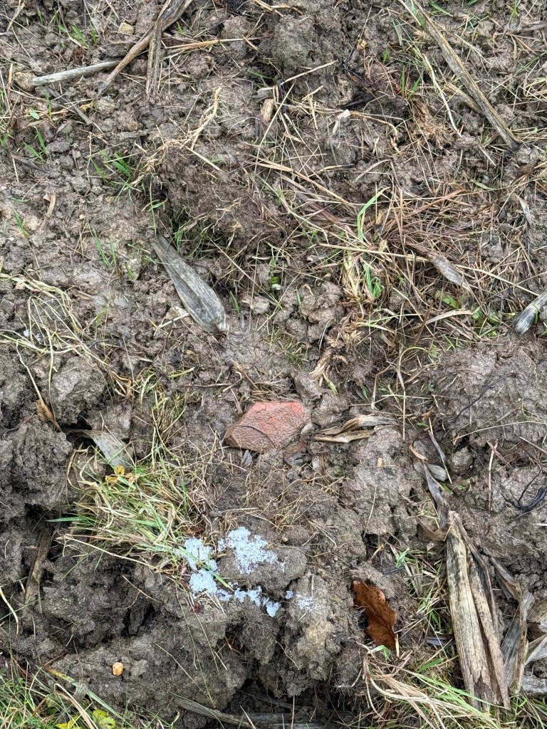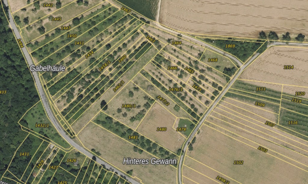 Auf dem anliegendem Acker im Norden konnten keine Funde gemacht werden. Was aber auffällt das in Böschungen und Büschen zwischen den Äckern immer wieder sehr große behauene Steine liegen. Die Grundstücke auf dem das Gebäude wohl lag sind heute zum großen Teil Streuobstwiesen. Dort wo sich die Quelle befindet ist ein kleiner Acker auf dem als einziges auch Stein und Keramikfunde zu sehen sind. Wenn man sich die LIDAR Karte ansieht fällt in Parzelle 1480/1 eine Erhöhung auf die man mit den Augen vor Ort kaum sieht. Es handelt sich dabei nicht um die runde, deutlich höhere Einfassung der Quelle.