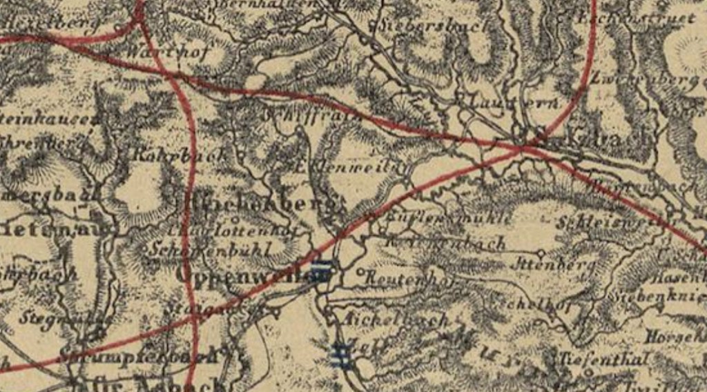 Endlich haben wir noch einer Straße zu gedenken, die ohne Zweifel von den Römern angelegt wurde und häufig noch Spuren der ursprünglichen Pflasterung trägt; sie lief von Sulzbach den Bergrücken hinaus in den Wall Roßstatt, weiter durch die Walddistrikte Greut und Brenntenhau, 1/4 Stunde südlich am Warthof vorüber und vermuthlich weiter nach Oberstenfeld.
