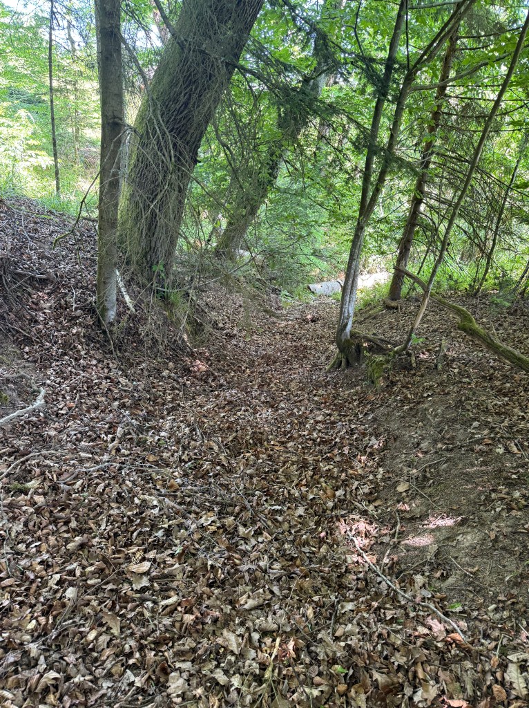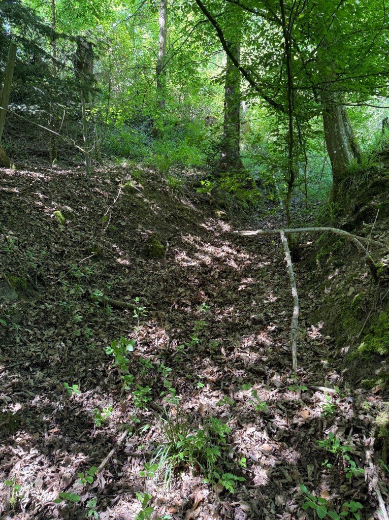 Mehrere alte Wege führen zur Burg, die zwar stark zugewachsen sind, aber dennoch deutliche Spuren im Wald hinterlassen haben. Dies deutet darauf hin, dass die Burg einst regelmäßig genutzt wurde und nicht isoliert war. Darüber hinaus sind im weiteren Umkreis zahlreiche größere Quadersteine zu finden, was möglicherweise auf eine einst umfangreiche Bebauung oder die Wiederverwendung von Baumaterial hinweist.