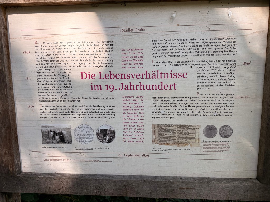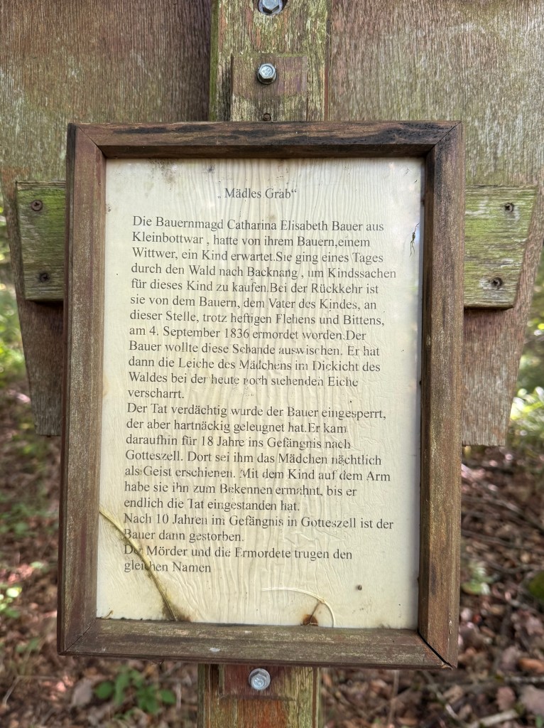 Die ermordete war Catharina Elisabetha Bauer, geboren am 11. März 1805, Tochter von Eberhard Gottfried Bauer. Sie wurde am 4. September 1836 getötet; ihre Gebeine fand man am 26. Februar 1837. Der Täter, Johann Gottlieb Bauer, geboren am 13. Februar 1813, wurde am 10. Juli 1838 zu 18 Jahren Zuchthaus verurteilt und starb am 21. Dezember 1848 im Zuchthaus Gotteszell in Schwäbisch Gmünd.