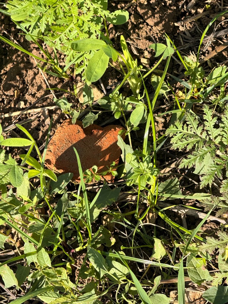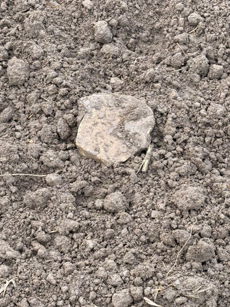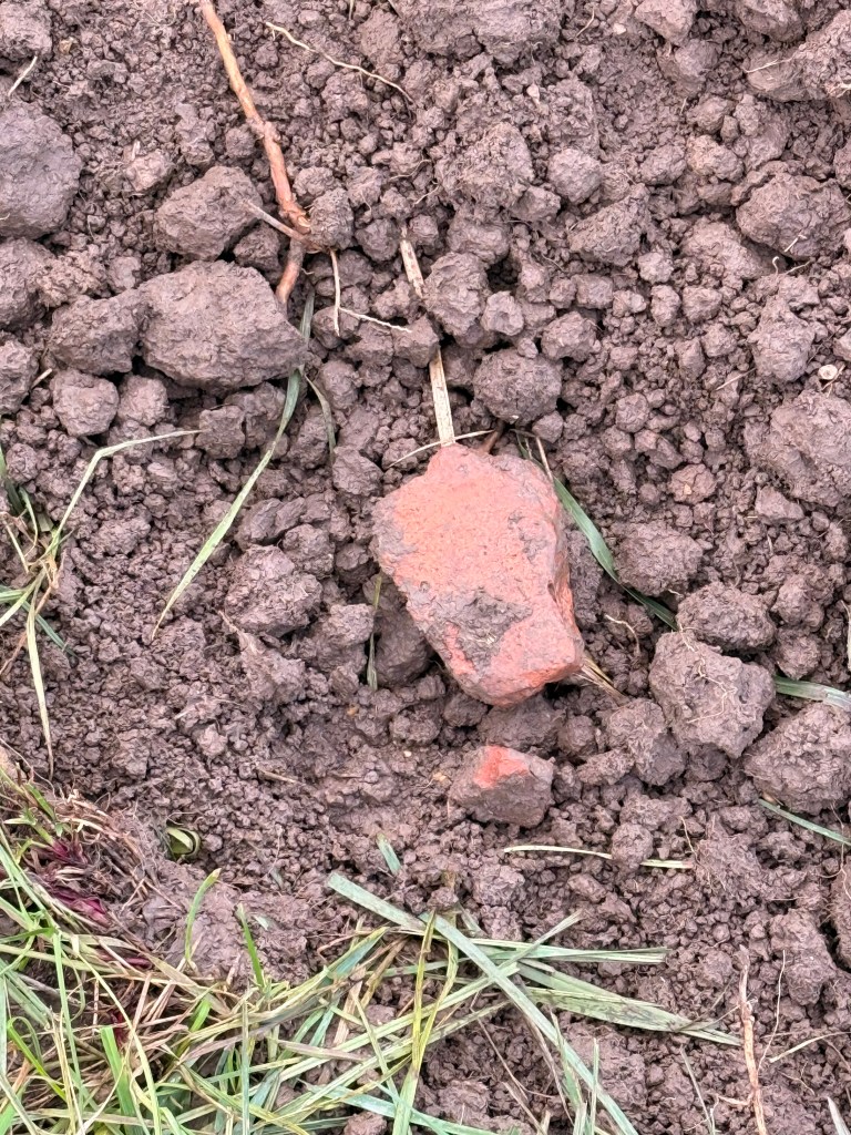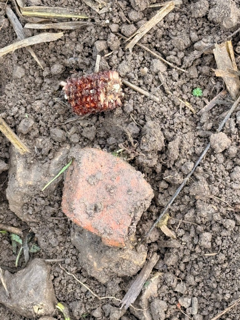 Weiter östlich erstreckt sich ein Feld, auf dem ich zahlreiche Steine sowie eine beachtliche Menge Tonscherben entdecken konnte. Besonders auffällig waren eckige Fragmente, aber auch einige gebogene Stücke waren darunter. Die Funde konzentrieren sich auf einen eher kleinen Bereich des Feldes. Leider war eine weitergehende Untersuchung bislang nicht möglich, da das Feld derzeit noch mit Mais bepflanzt ist.