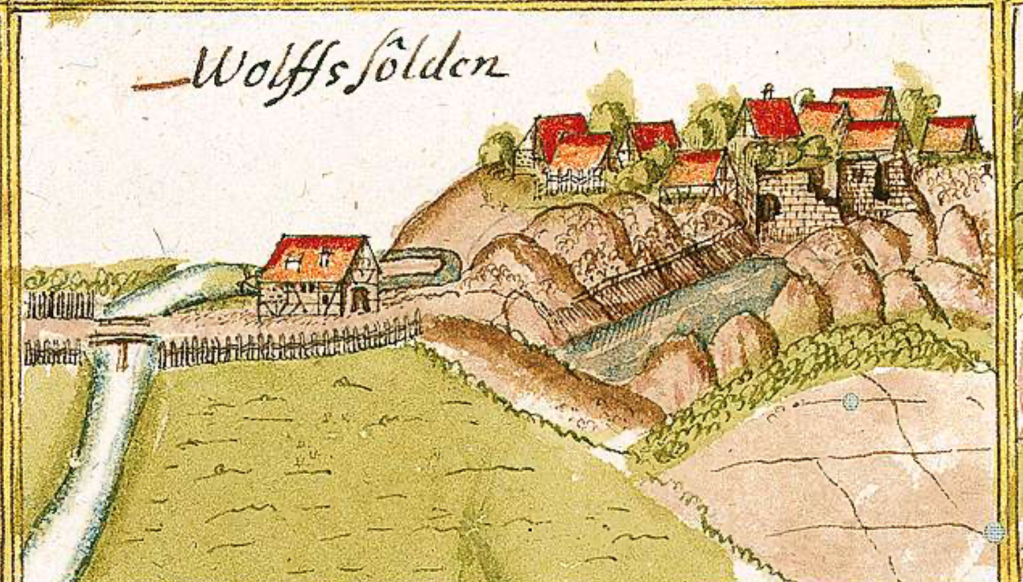 Heute bietet sich in Wolfsölden ein unscheinbarer Anblick: eine Wiese, ruhig und unspektakulär. Von der einst mächtigen Burg, die hier das Tal überragte, sind auf den ersten Blick keine sichtbaren Spuren mehr zu erkennen. Doch wer sich die Mühe macht, den Abhang zum Buchenbach hinabzusteigen, entdeckt eine andere, stillere Geschichte im Gelände. Immer wieder zeichnen sich alte Wege ab, die sich teils am Hang entlangziehen, teils den Abhang hinunterführen. Ihre genaue Entstehungszeit lässt sich nicht bestimmen, doch sie wirken wie Relikte einer vergangenen Nutzung – vielleicht einst von Fuhrwerken oder Fußgängern begangen, die zur Burg oder zur Mühle unterwegs waren.
