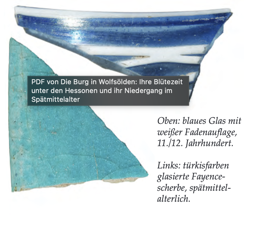 Die Funde aus Glas, Metall und Keramik belegen die hohe Stellung der Burgbewohner. Besonders hervorzuheben sind eine Scherbe eines orientalischen Glasbechers mit weißer Fadenauflage aus dem 11./12. Jahrhundert sowie eine türkis glasierte Fayencescherbe mediterraner Herkunft. Metallfunde wie Pfeilspitzen, ein Stachelsporn und eine Lockpfeife für die Falkenjagd ergänzen das Bild einer repräsentativen Adelsburg.