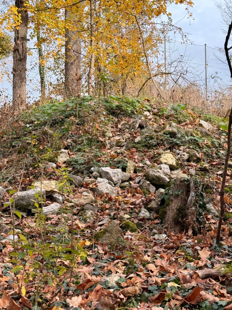 Wer sich in der näheren Umgebung umsieht, entdeckt eine Vielzahl von Geländespuren: kleine Erhöhungen und Vertiefungen, alte Wege sowie aufgeschüttete Steine. All dies vermittelt den Eindruck, dass der Berg einst intensiv genutzt und vielleicht sogar besiedelt war.