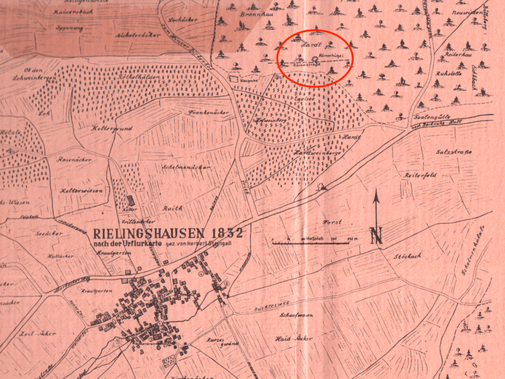 Nördlich von Rielingshausen befindet sich ein Grabügel unmittelbar am Neubaugebiet sowie leicht nördlich der dort befindlichen Römerstrasse.