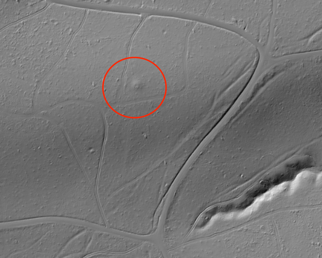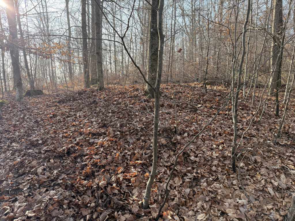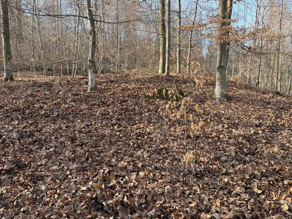 In diesem Areal liegt ein deutlich im LIDAR-Scan zu erkennender vorgeschichtlicher Grabhügel. Mit an Sicherheit grenzender Wahrscheinlichkeit ist mit archäologischen Befunden zu rechnen.