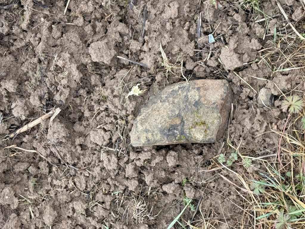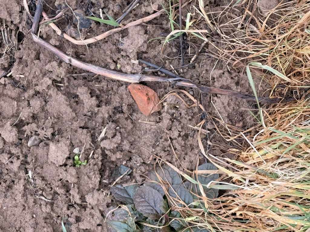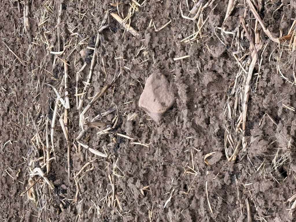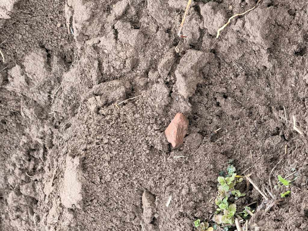 Der vermutete Standort des Gutshofes zieht sich vom Bachlauf hinauf bis zu einem kleinen Hügel, der das Gelände überragt. Auf den Feldern finden sich vor allem die typischen Hinweise römischer Präsenz: zahlreiche Steine und vereinzelte Tonfragmente. Der Acker war bei meinem Besuch frisch aufgebrochen, doch der anhaltende Regen machte eine gründliche Begehung nahezu unmöglich – weitere Funde blieben daher aus.