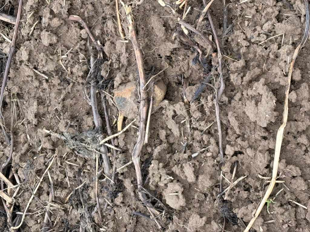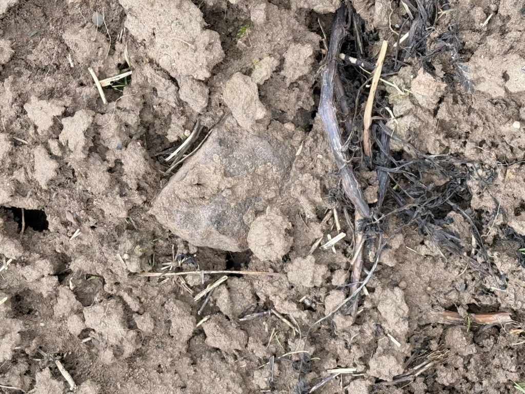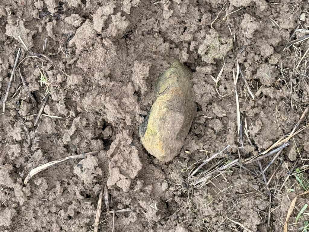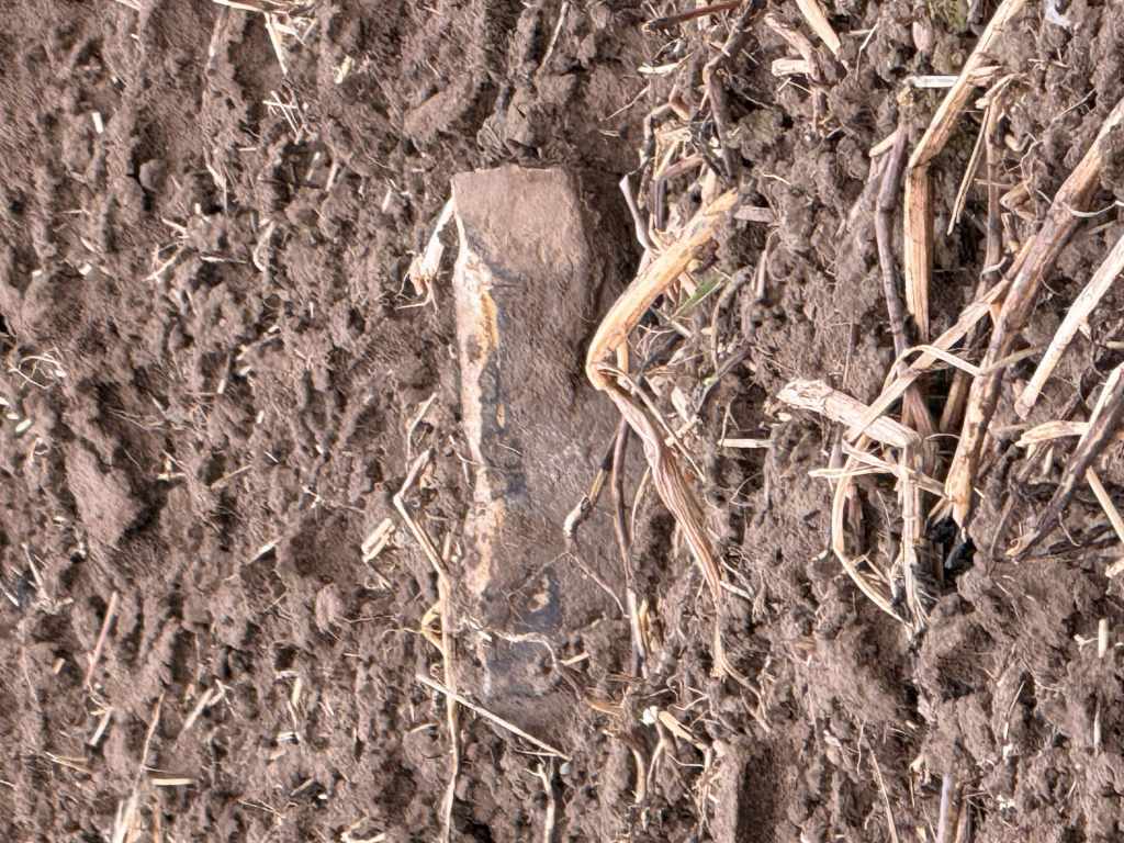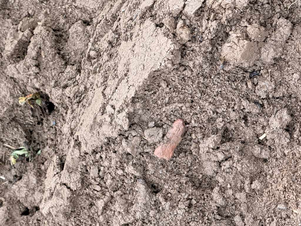 Der vermutete Standort des Gutshofes zieht sich vom Bachlauf hinauf bis zu einem kleinen Hügel, der das Gelände überragt. Auf den Feldern finden sich vor allem die typischen Hinweise römischer Präsenz: zahlreiche Steine und vereinzelte Tonfragmente. Der Acker war bei meinem Besuch frisch aufgebrochen, doch der anhaltende Regen machte eine gründliche Begehung nahezu unmöglich – weitere Funde blieben daher aus.