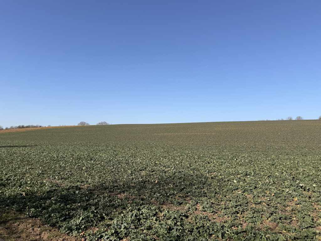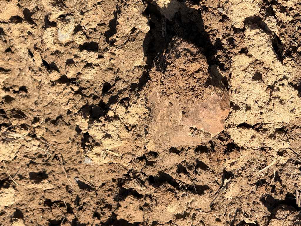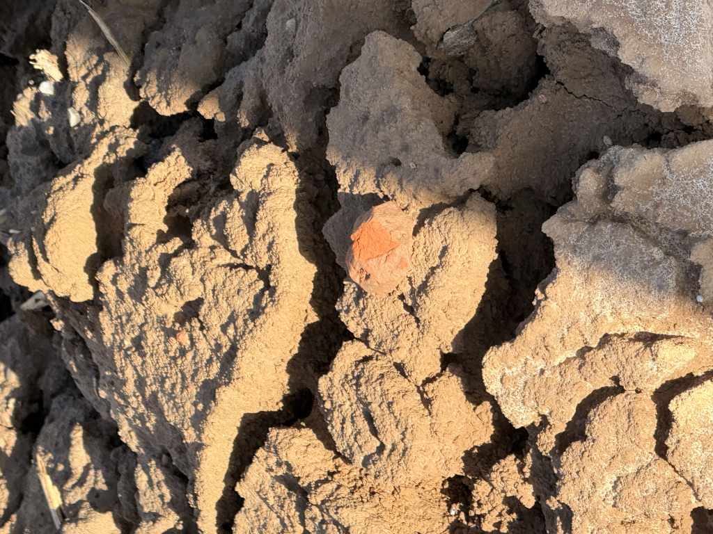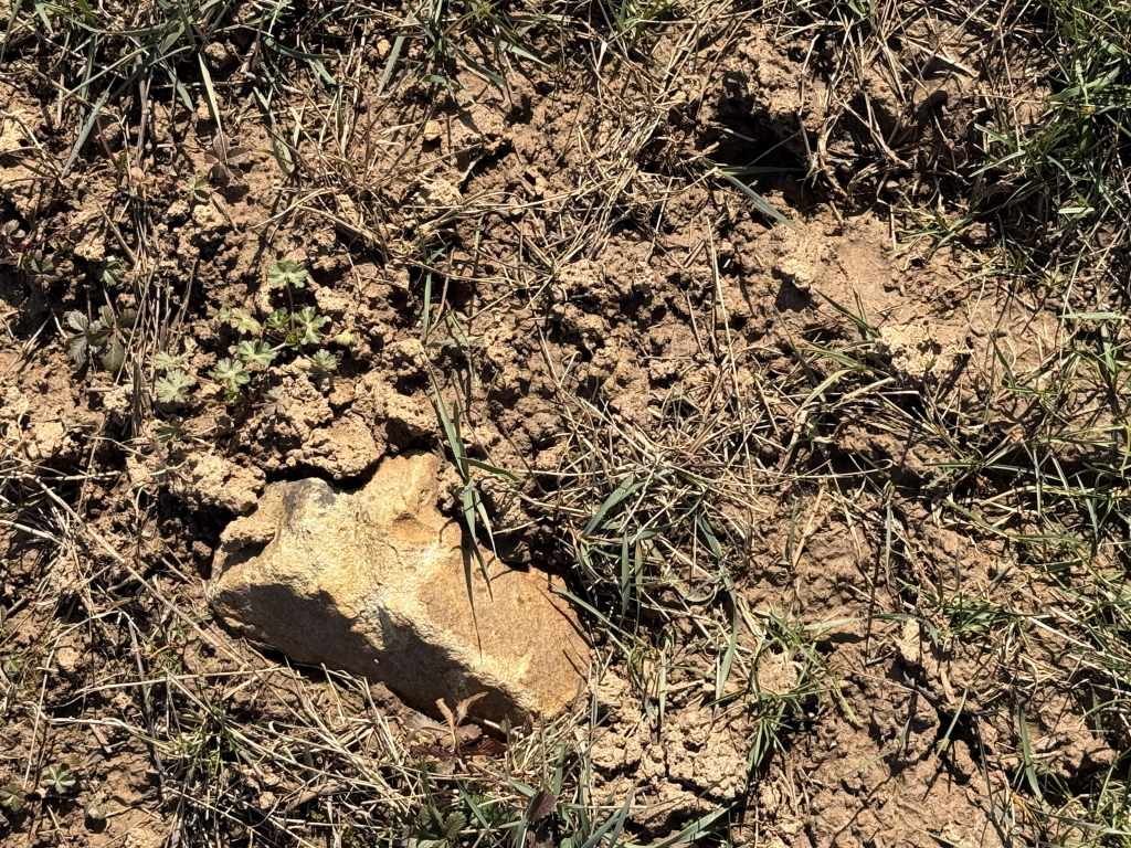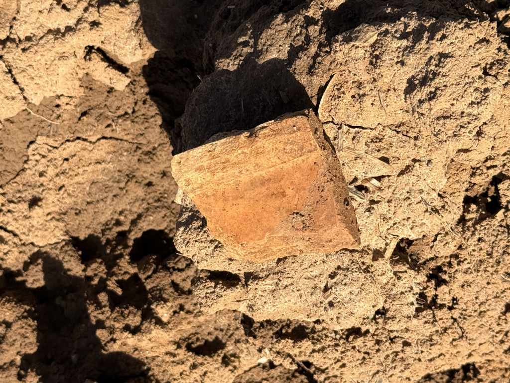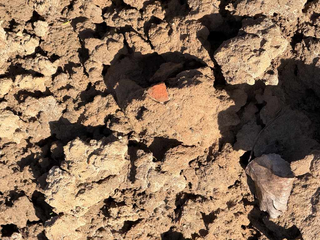 Im Gelände zeigen sich deutliche Spuren menschlicher Eingriffe. Entlang des Hügels zieht sich ein Vorsprung rund 100 Meter weit den Hang entlang. Im aufgebrochenen Erdreich finden sich Steine, wie man sie auch an anderen römischen Gutshöfen beobachten kann, ebenso Keramik- und Tonfragmente. Zum Zeitpunkt meines Besuches war ein Feld bereits bepflanzt und ein anderes frisch umgebrochen – aufgrund des feuchten Wetters jedoch für mich nicht begehbar. Im bepflanzten Feld sind kahle Stellen zu sehen.